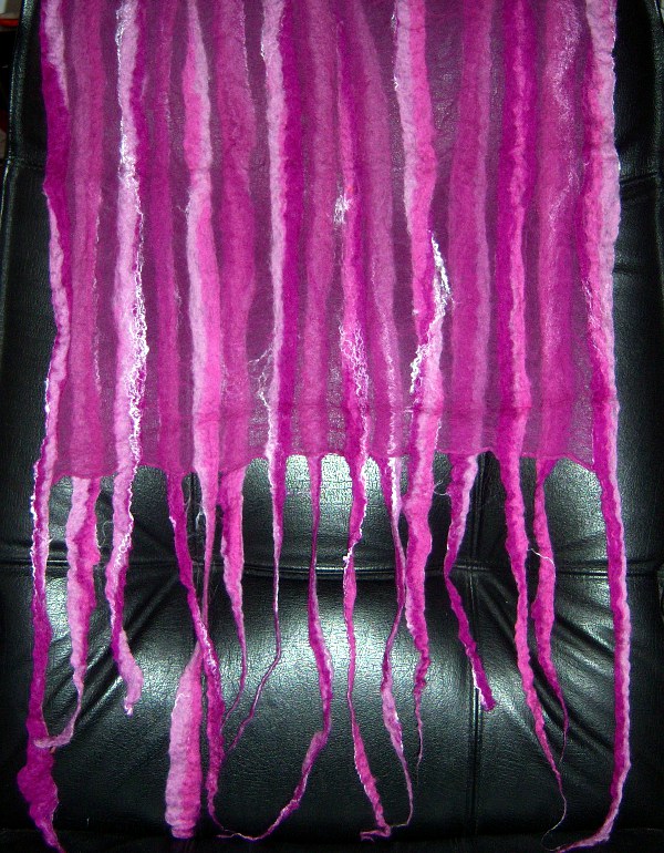 "Nuno" ist japanisch und bedeutet "Stoff", "Gewebe". Nuno-Filzen ist eine besondere Filztechnik, in der man zarte Stoffe wie Seide, Organza, Chiffon etc. mit Wolle zu transparenten Geweben verbindet. Dadurch entstehen völlig neue und sehr interessante Stoffe und Strukturen - wie z.B. eben dieser Nunoschal!